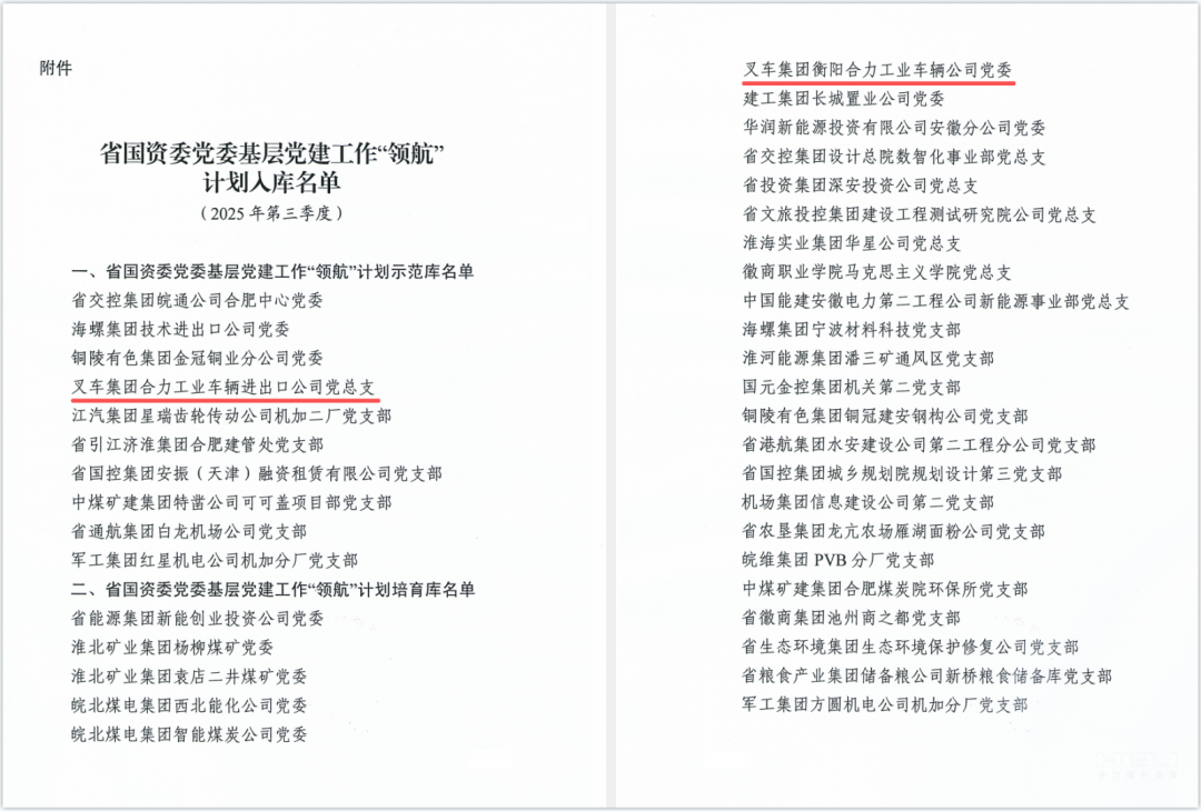 安徽叉車集團(tuán)黨委兩個(gè)黨組織分別入選省國資委黨委基層黨建工作“領(lǐng)航”計(jì)劃示范庫、培育庫